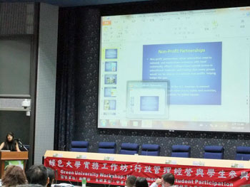 Speakers placed a special focus on student engagement in Taiwan, an island located off China’s southeastern coast; undergraduates were challenged to take leadership roles in campus environmental efforts.