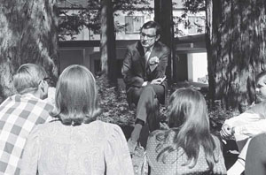 If you would like to impress your colleagues with your knowledge of ancient trivia, tell them that the photo on the back cover of the fall ’14 Review (shown below right), is not of Tom Vogler, it is Peter Smith, assistant to Chancellor McHenry for arts, who left a couple of years after this picture was taken (in 1966) to direct Dartmouth’s Hopkins Center for the Arts. It was not a seminar, it was a posed photo, taken by Al Lowry, the first campus photographer, with yours truly in the checked shirt on the left.