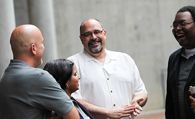 Darrell Long (center) shared a laugh with students and visitors at the Baskin School of Engineering’s Research Review Day. (Photo by C. Lagattuta)