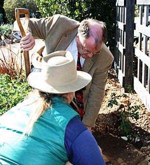 As part of the celebration, Farr and Christof Bernau, manager of the Farm garden, planted an heirloom climbing rose–the first in a new rose garden established in Farr’s honor. An adjacent plaque honors Farr for his “visionary support of sustainable food and agriculture research and education.” The plaque was fashioned by the UCSC Sign Shop out of redwood reclaimed from the Farm’s solar greenhouse, which was recently torn down to make way for a new facility.