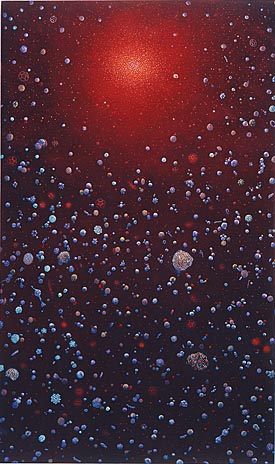 Gwyn’s oil-encrusted works can take months and even years to dry. She begins each one by pouring puddles of paint onto wood panels and molding the paint with her fingers, scalpels, and tweezers. Eventually, in a labor-intensive process that calls for multiple layers of paint, organic shapes resembling flowers, fruit, and leaves begin to appear and multiply. Artforum magazine noted that her paintings “look like enlarged slides of microscopic organisms whose apparent simplicity is belied, under closer scrutiny, by their teeming busyness.”