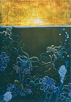 “In researching Prozac, I came upon a study that found there is so much Prozac in the culture that it’s ending up in wastewater, with the result that it may be affecting fish and frog populations and altering their reproductive cycles. So I created a surrealistic, fantastic pond-like site where frogs–an indicator species–are swimming among algae and seaweed that resemble human neurons and nephrons (the kidney filtration system)–as their realities and ours are intertwined.”