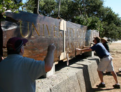 Campus crews hoisted the original off its concrete pedestal Monday morning and in its place lowered a nearly identical redwood timber carved with “University of California Santa Cruz” in gold letters.