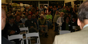 Approximately 100 people gathered at Greenspace in Santa Cruz to hear a community report on the year-old Climate Action Compact. (Photos by Guy Lasnier)