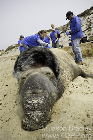 This is the second year TOPP has named seals. Naming the seals and tracking them through blogs is part of Elephant Seal Homecoming Days, a program sponsored by TOPP and California State Parks. Several thousand elephant seals return each winter from the far reaches of the North Pacific Ocean to molt, mate, and give birth to their pups on the beaches of Año Nuevo. To celebrate the migration, TOPP wanted to invite the community to witness and learn about the seals’ annual journey.
