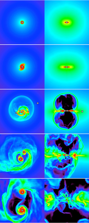 The rotation of the gas cloud as it collapses leads to the formation of a disk of material feeding onto the growing “protostar.” The disk is gravitationally unstable, however, causing it to clump and form a series of small secondary stars, most of which end up colliding with the central protostar. In the simulation, one secondary star became massive enough to break away and acquire its own disk, growing into a massive companion star. A third small star formed and was ejected into a wide orbit before falling back in and merging with the primary star.