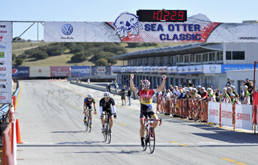 Andy Jacques-Maynes (Crown, ’00, economics) crosses the finish line with a victory at the Sea Otter Classic. Jacques-Maynes won the men’s pro 1-2 circuit race. (Photo courtesy of Inferno Racing)