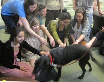 In its report about the program, the Santa Cruz Sentinel spoke with Layna’s owner, UCSC librarian Ann Hubble, “who has witnessed students’ study stress all too often … She has seen firsthand how well students on campus react to encountering a friendly canine, where dogs are not normally permitted.”