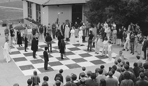 One year, four preceptors covered every inch of an empty room underneath the Cowell dining hall with supermarket posters advertising fruits and vegetables. They dubbed it “The Fruit Room” and invited the entire college to a party there—a combination art installation and “happening.” A series of sculpture based on poses from the Kama Sutra appeared unannounced on the hills of campus. A human chess game saw Art Professor Holmes riding up on a horse dressed as the red queen, while History Professor Jasper Rose once led the entire World Civilization class in a performance of Handel’s Messiah.