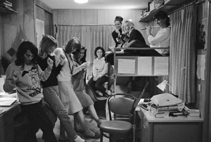 Each trailer housed eight, same-gender students—four at either end with a fake-marble bathroom in the middle. Stuffed with bunk beds, desks, typewriters, clothing, and surfboards, some of the trailers came to look like they were in a perpetual state of ransacking.