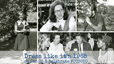 In honor of its 50th anniversary celebration beginning this month, UC Santa Cruz is getting the party started on January 15 with informal 1965-style dress-up day on campus, harkening back to the days when Twiggy the supermodel wore cape-jacketed suits. This was the time when a bold fashion statement for women was showing up to work in pants instead of a skirt.
