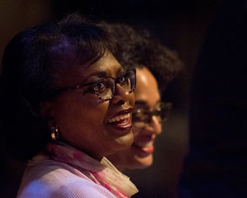 Anita Hill before her presentation on Thursday night. Behind her is UC Santa Cruz feminist studies professor Gina Dent, who introduced Hill. (Photo by Tosh Tanaka)