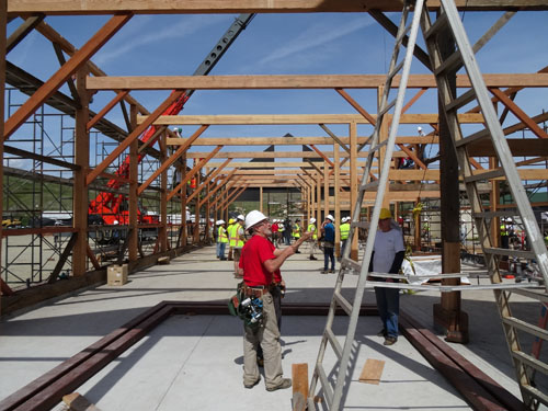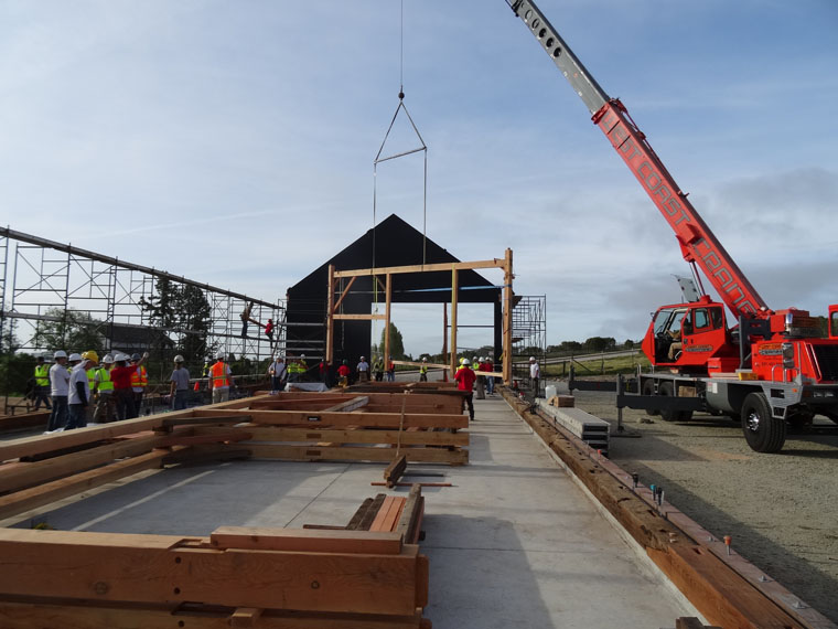 With 11 bents in place, workers prepare for the next layer of the new Cowell Ranch hay barn. When the barn is complete, the timber superstructure will be visible from the inside.
