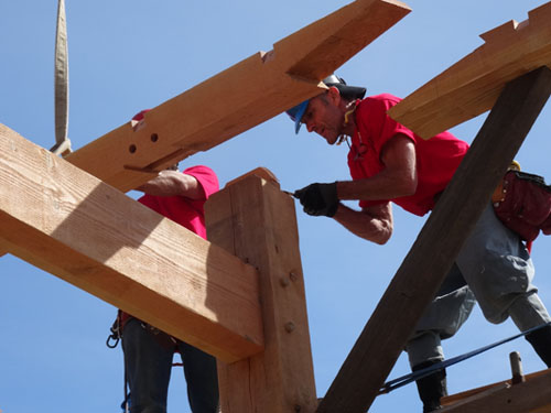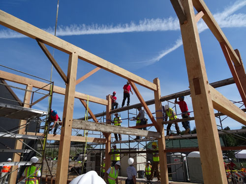 The barn raising Saturday, March 21, 2015 at the base of the UC Santa Cruz campus progressed remarkably smoothly with about 20 professional timber framers leading the action and a crew of 50 skilled volunteers supplying additional labor. By noon a large crowd had gathered on a nearby hillside to watch the installation of massive but intricately fitted timbers. By late afternoon Sunday, all timber framing was finished.