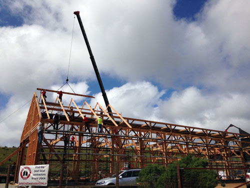 Sunday afternoon, the first ridge beam is about to be set after six pair of rafters are in place.