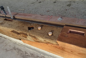 A 150-year-old redwood sill plate, left, is linked with pegs to a newly crafted redwood sill, right, to support barn bents. Tenons on the bents will fit into mortises cut into the sill plates.