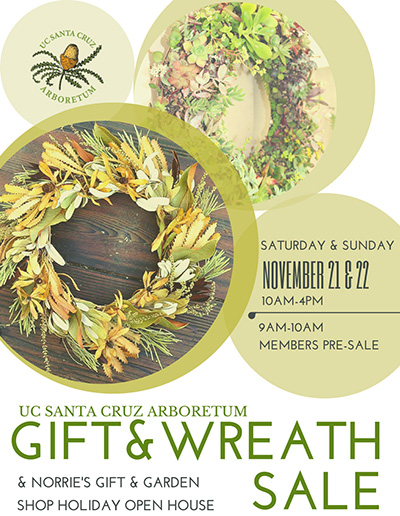 The UC Santa Cruz Arboretum’s annual Gift and Wreath Sale will be held on Saturday and Sunday, November 21 and 22, in conjunction with an Open House at Norrie’s Gift and Garden Shop. Hours are 10 a.m. to 4 p.m. both days, with early access for Arboretum members only from 9 to 10 a.m. The sale takes place at the Horticulture II Building.