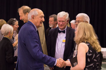 Emeritus professor John Dizikes greeted well-wishers after his keynote remarks. Photo by Steve Kurtz.