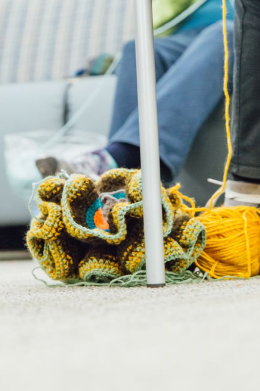 Roberts is happy with the “come one, come all” aspect of the crocheting circles, which have been meeting weekly. She was amazed when she showed up to one of the early sessions for the coral reef project on campus, “and there were 175 people at Stevenson College, and all this yarn.”