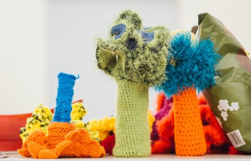 One chilly January evening at UC Santa Cruz, a group of crochet enthusiasts—a dozen students and four Santa Cruz community members—met for a student-led crochet circle at a multipurpose space known as the Red Room at Rachel Carson College to work on the satellite project. They concentrated on their work, adding wooly flourishes to the simulated reef.