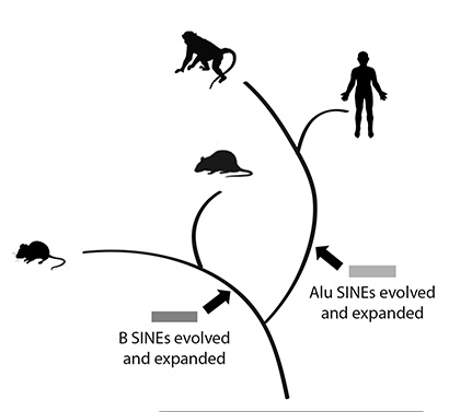 The mouse genome, however, doesn’t have Alus; instead it has a distinct set of SINEs called B/ID elements. Different mammalian genomes have different SINEs because periodic bursts of retrotransposition by different SINEs continued to occur after the separation of different species from their last common ancestors. In the case of human and mouse, their lineages diverged about 90 million years ago.