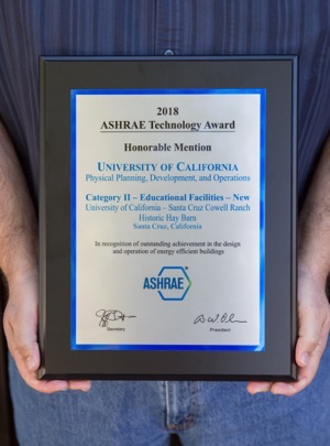 The barn won technology awards from the Golden Gate Chapter and Region X of ASHRAE, a 56,000-member organization that represents heating, ventilation, air conditioning, and refrigeration professionals. The project also received an honorable mention in the national ASHRAE competition.