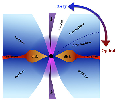 In the new model, it is the viewing angle of the observer that accounts for differences in the observations. Galaxies are oriented randomly with respect to the line of sight of observers on Earth, who see different aspects of a tidal disruption event depending on its orientation.