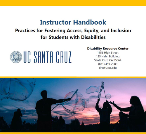 This month, the UCSC Disability Resource Center (DRC) is making available an instructor handbook entitled, “Practices for Fostering Access, Equity, and Inclusion for Students with Disabilities.” A collaborative endeavor between the Division of Student Success and the Center for Innovations in Teaching and Learning (CITL), the handbook was compiled in response to feedback over the past few years about the need for a comprehensive, practical guide to better support classroom instructors–including faculty, GSIs, and TAs–in serving students with disabilities at UCSC.