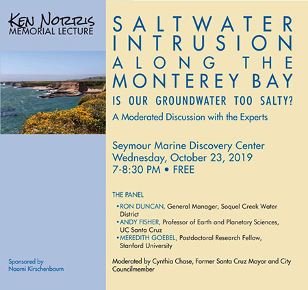 The 2019 Ken Norris Memorial Lecture on Wednesday, October 23, addresses saltwater intrusion along the Monterey Bay: Is our groundwater too salty?