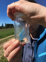 Mating Ohlone tiger beetles collected in a vial from the UCSC Campus Natural Reserve. This site was selected as one of three sites to use in the translocation of adult Ohlone tiger beetles because it’s known to have a stable beetle population. (Photo courtesy of Lynn Overtree)