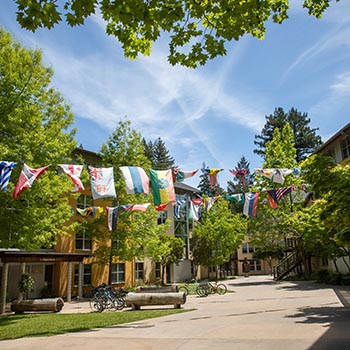 A collection of international flags hangs between the College Nine residential buildings. Photo by Carolyn Lagattuta.