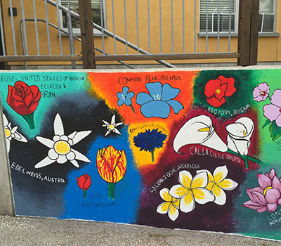 The expressive murals highlight global communities and social justice themes. One mural, titled, “Flowers Around the World,” depicts popular flowers in various countries. Artists Eden Ricci (College Nine ’19, German studies) and Jenny Fullerton (Crown ’19, computer science, computer game design) created the mural to show that every country is beautiful in its own way.