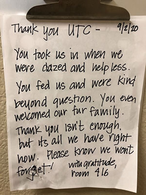 Some evacuees relocated with loved ones, while others were taken to the University Town Center in Santa Cruz or to various Santa Cruz hotels, including the Carousel Beach Inn and the Sea and Sand Inn. One campus employee, shortly before leaving the UTC, left a heartfelt note of appreciation: “You took us in when we were dazed and helpless. You fed us and were kind beyond question.”
