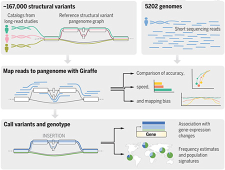 “A lot of structural variants have been discovered recently using long-read sequencing,” he said. “With pangenomes, we can look for these structural variants in large datasets of short-read sequencing. It’s exciting because this will allow us to study those new structural variants across many people and ask questions about their functional impact, association with disease, or role in evolution.”