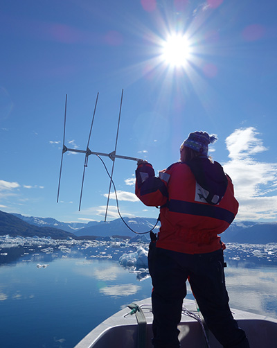 After the heart-rate tags fell off of the narwhals, they were retrieved by boat. Here a research team member surveys the local waters using a VHF antenna to pick up a radio signal from the tag. (Photo by Terrie Williams)
