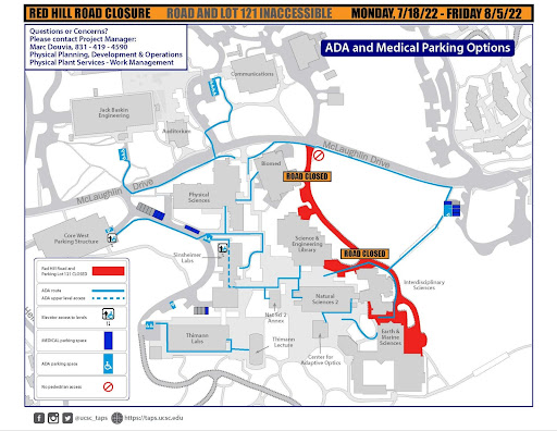 - ADA parking spaces along Red Hill Road will be taken out of service for the duration of the project (July 18th through August 5th); please contact TAPS or the UCSC Project Manager (Marc Douvia) to request and coordinate appropriate accommodations.