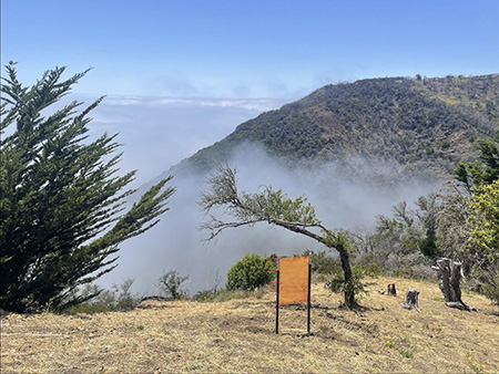 The coastal reserves of Big Creek and Santa Cruz Island have been the sites of some of Karlic’s own work. For years, scientists have set up fog collectors—vertical squares of mesh where airborne moisture can condense—to measure the amount of moisture fog supplies at different elevations at the reserve. Inspired by this data collecting tool, Karlic has set up similar vertical moisture collectors but substituted copper plates, typically used in print media, for the mesh. On Karlic’s collectors, fog leaves behind visual traces of its passage in the form of oxidized patterns on the metal.