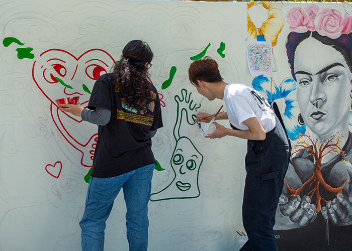 Muralist Kayson Tang designed his mural submission to reflect his personal art style and showcase the creativity and playful spirit of his work. Alongside his roommate and friend, Melissa Contreras, he worked to complete the mural on Moat Day, after months of developing the piece from concept to completion.