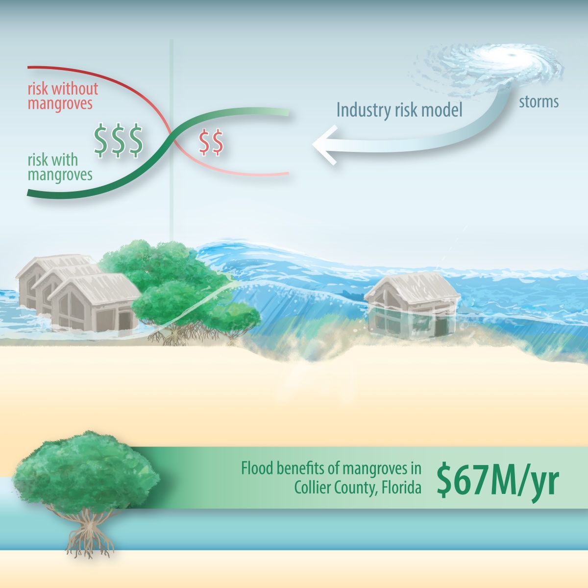 - In Florida’s Collier County, mangroves provide about $67 million in storm surge protection each year.